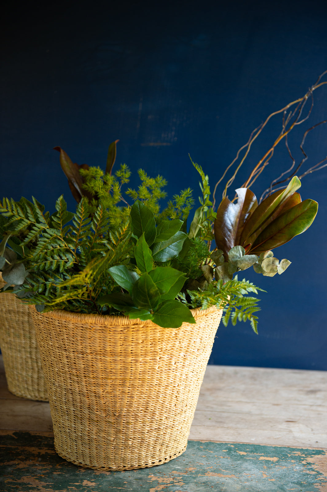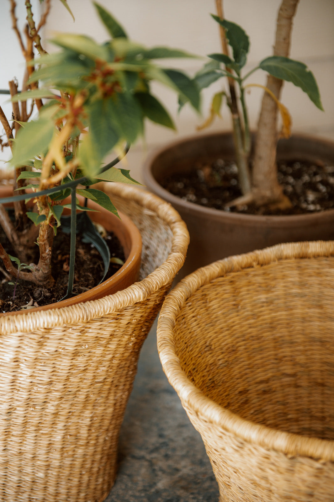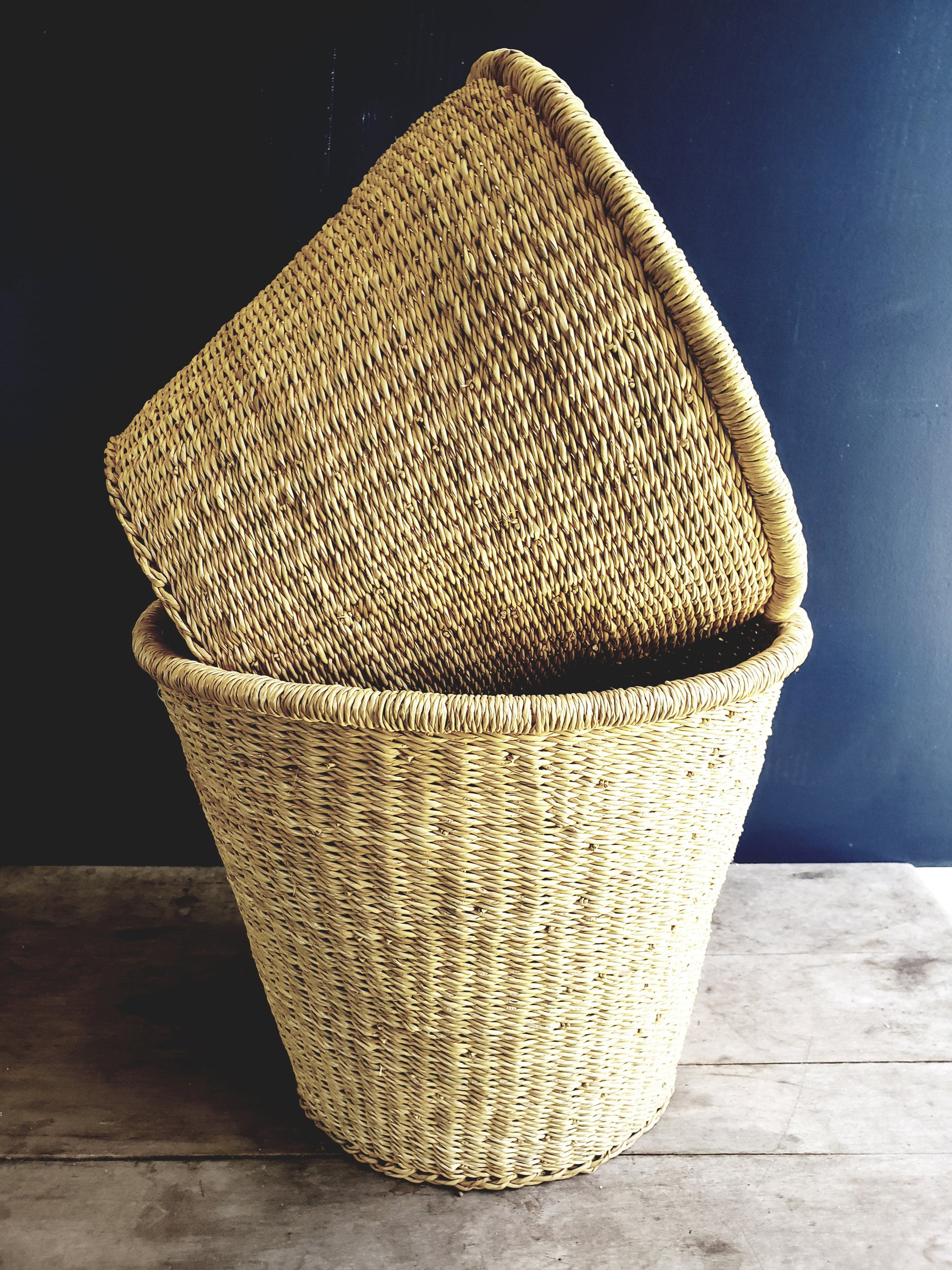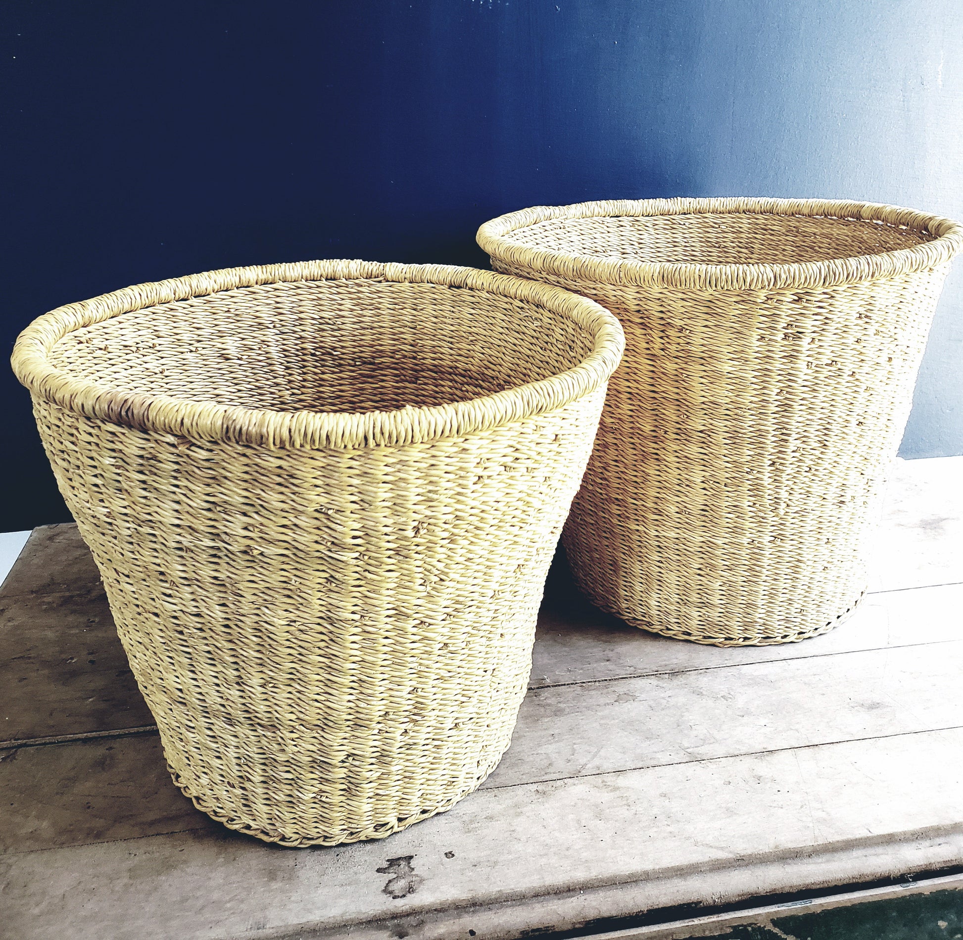 Enhance your home organization with this striking set of two commodious storage baskets. These large baskets are versatile enough to serve as a chic wastepaper basket or a stylish cover-up for your beloved potted plants. Made with premium quality materials, these baskets offer durability and long-lasting performance.