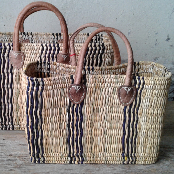 Sturdy and lovely tote, natural water reed with blue striped pattern dyed into the reed. Tasteful and classic. Thick long leather handles.