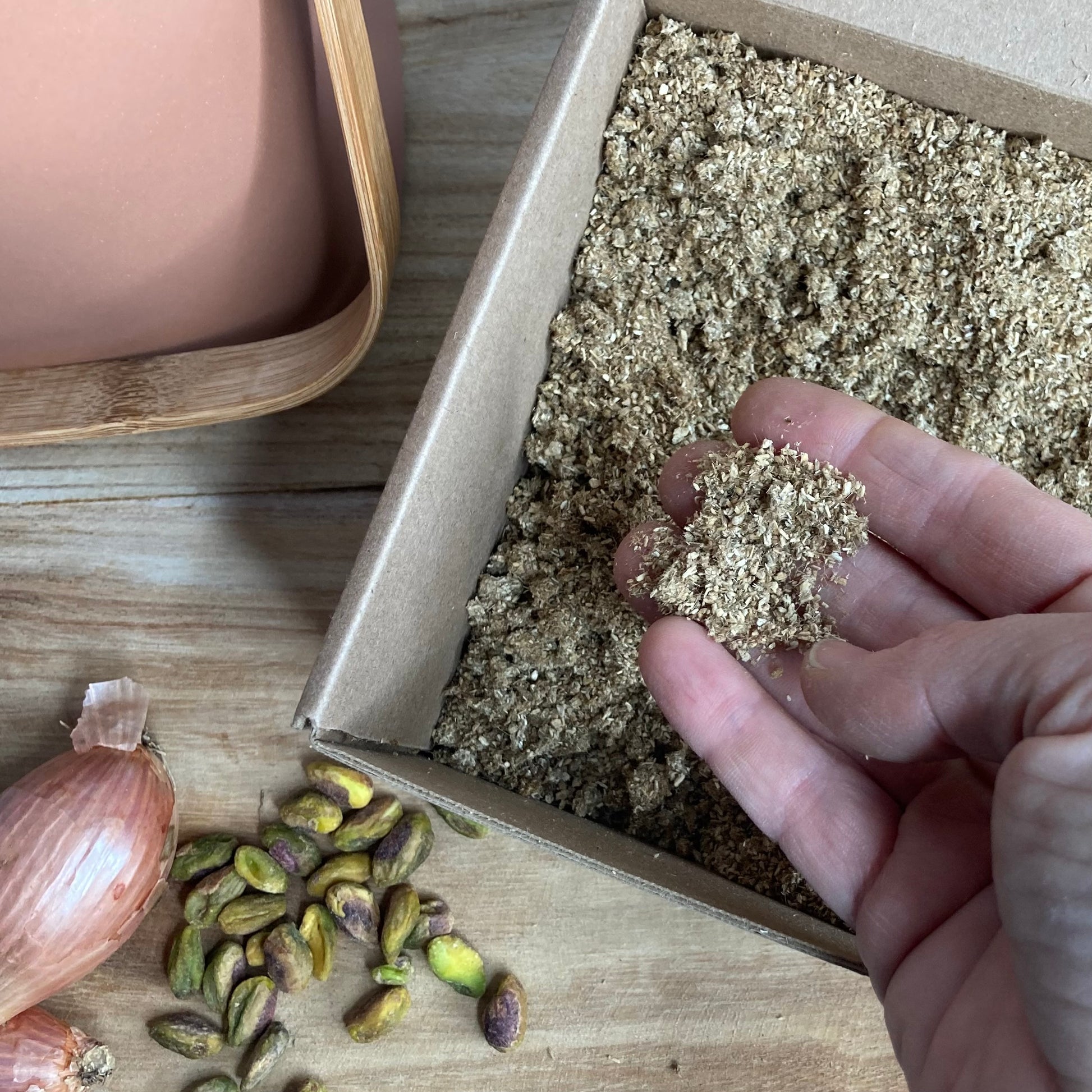 Add 1/8 cup of Kenkashi hemp to your kitchen compost bin as you layer