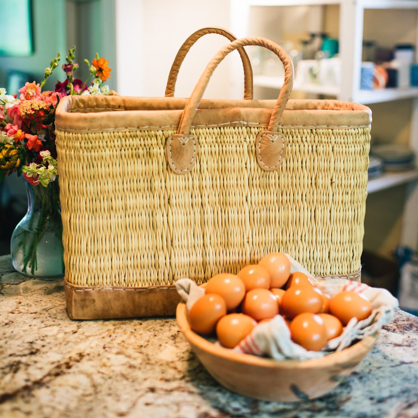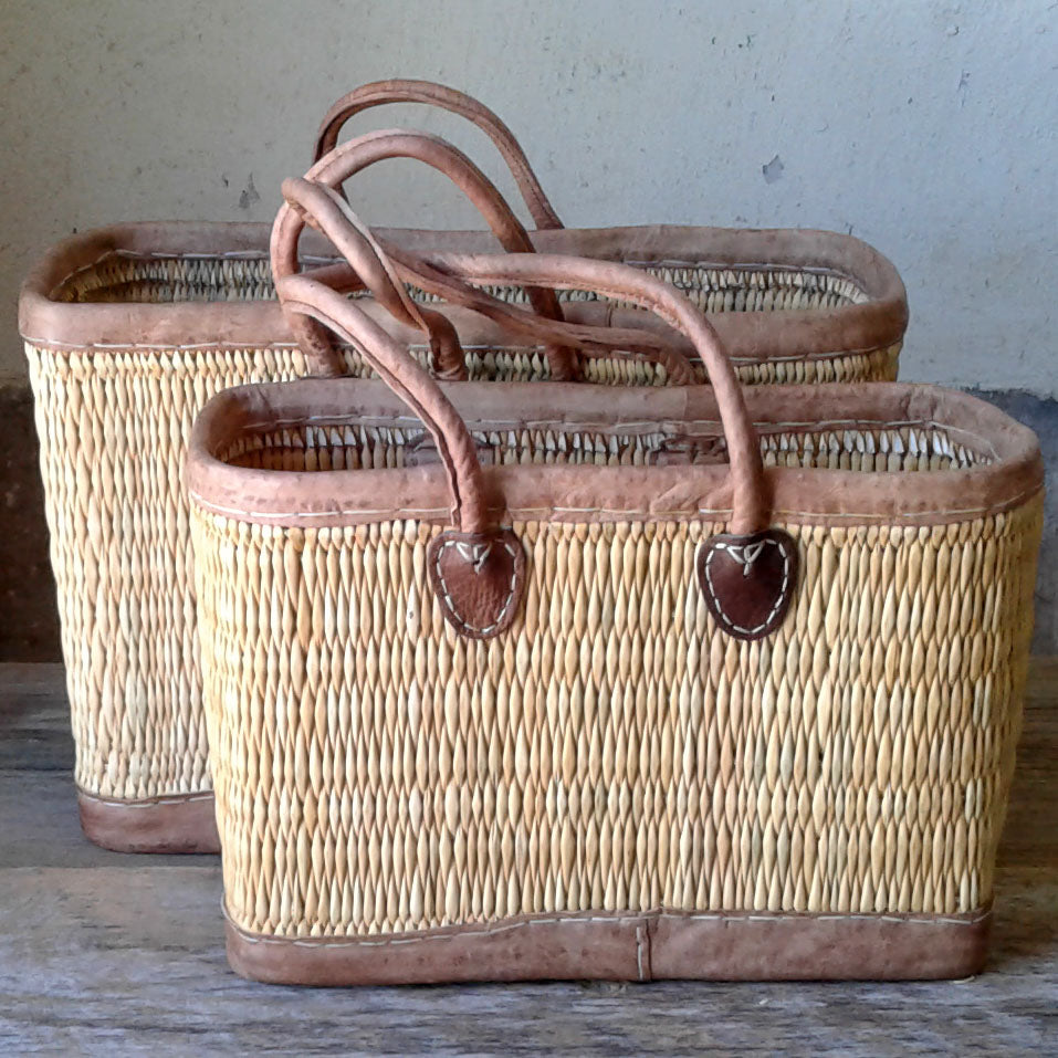 This is a gorgeous tote that is both stylish and practical. Made of tightly woven water reed and trimmed with leather, it's perfect for daily use or as a sturdy storage basket. The leather bottom is finished with rivets to provide extra protection and durability.