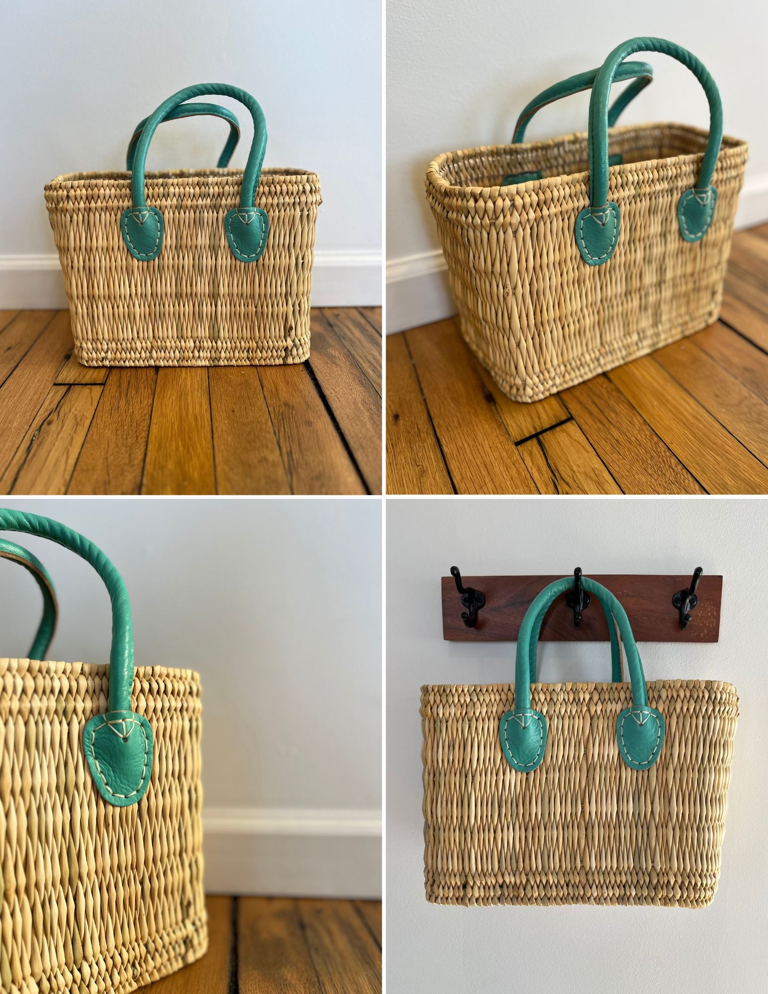An adorable Itty Bitty Tote, the perfect combination of charm and versatility. This small tote is not only a stylish accessory but also serves as an excellent choice for a gift basket. Its flat weave design adds a touch of texture, while the round leather handles provide a comfortable and elegant carrying option. This tote has cheerful teal handles.